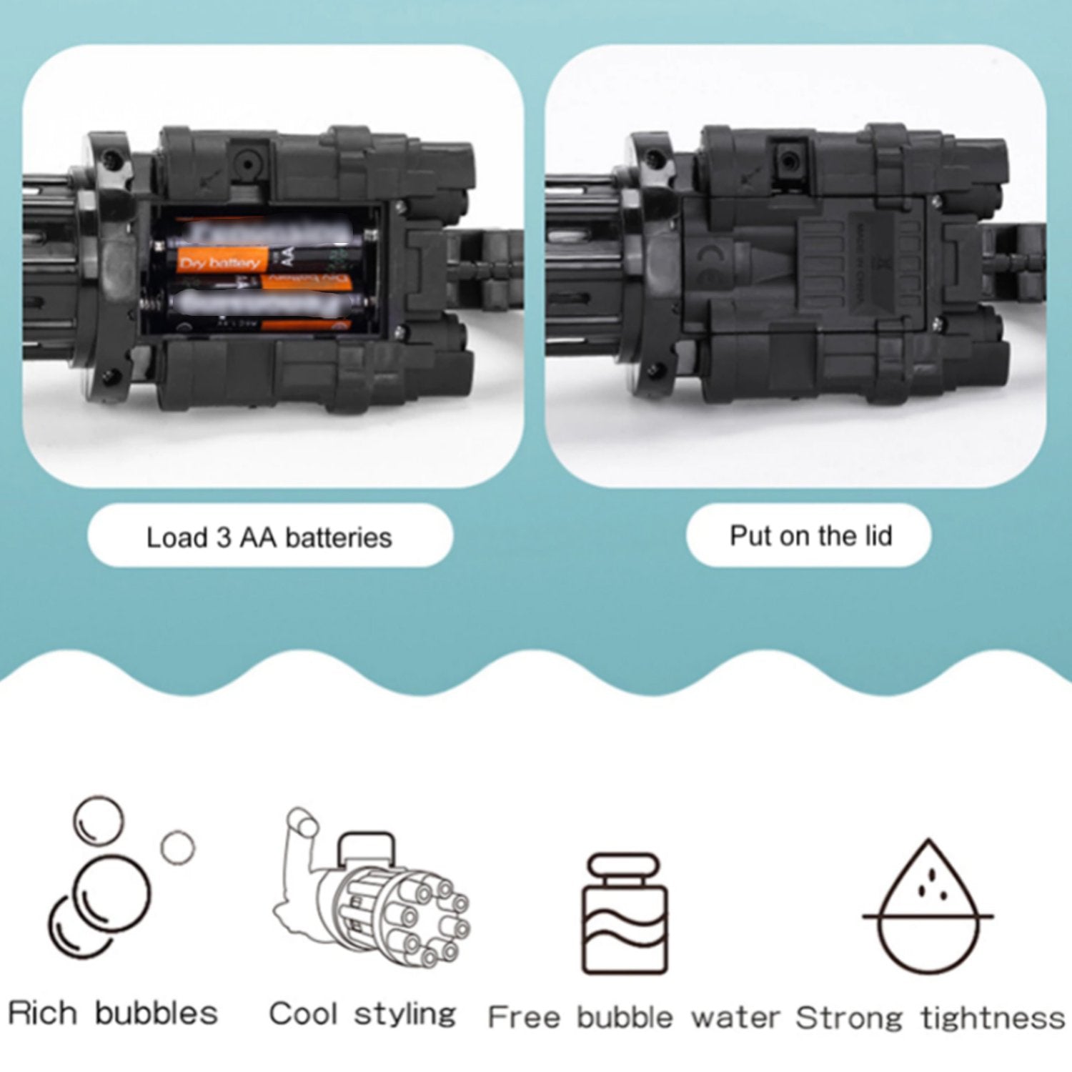 - EASY TO USE. You only need to install three AA batteries (not included batteries), just pour the bubble water on the spare board, immerse the muzzle of the bubble gun in the bubble water, and then press the switch to enjoy the bubble time.